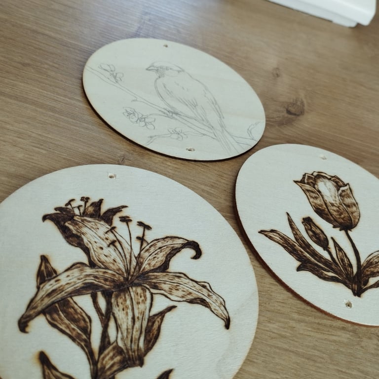 Pyrography, also known as pokerwork, is the art of decorating wood or other materials by burning a design on the surface with a heated metallic tip. I started this hobby in January 2025.